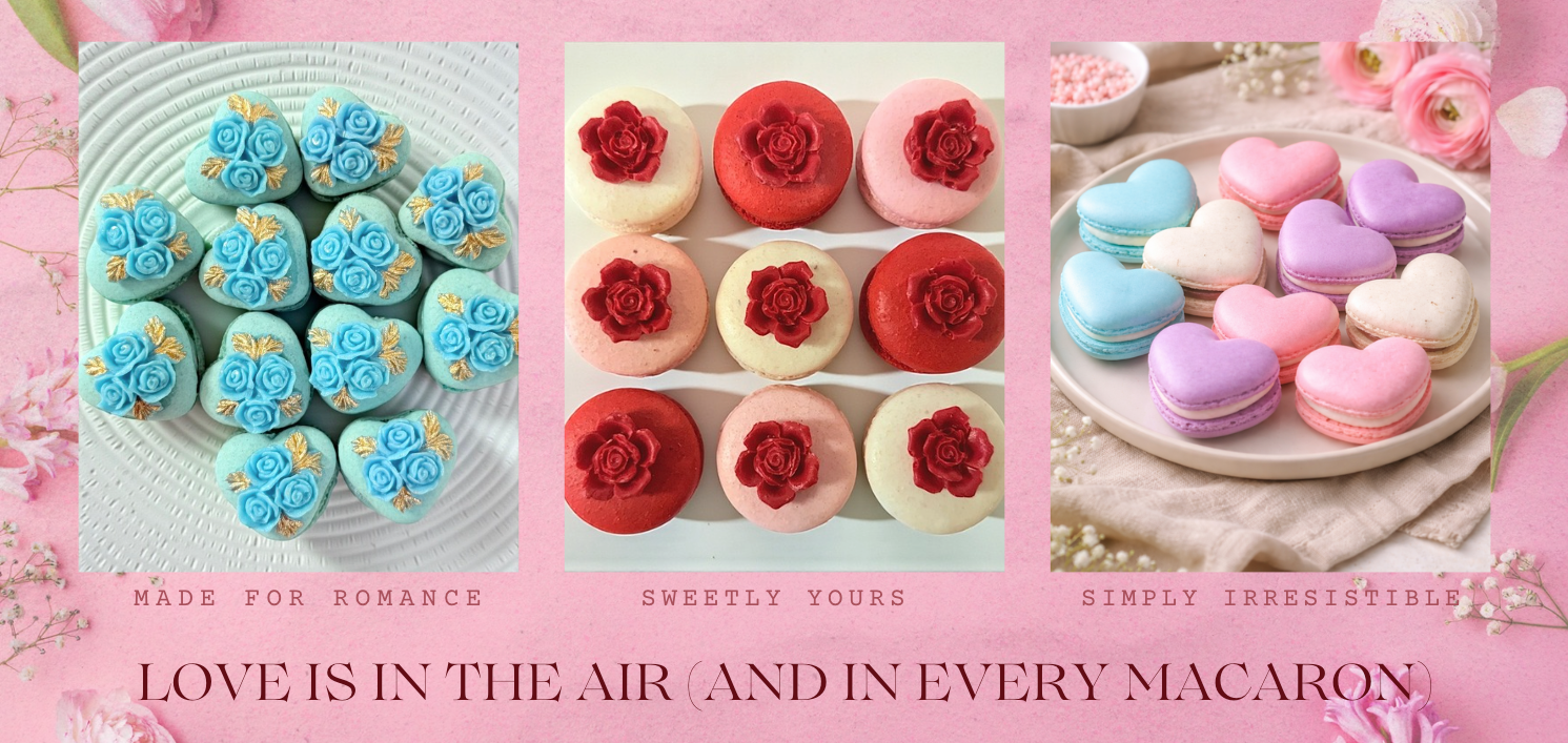 Delicately crafted heart-shaped macarons finished with elegant rosette details. Made for romance, perfect for gifting.