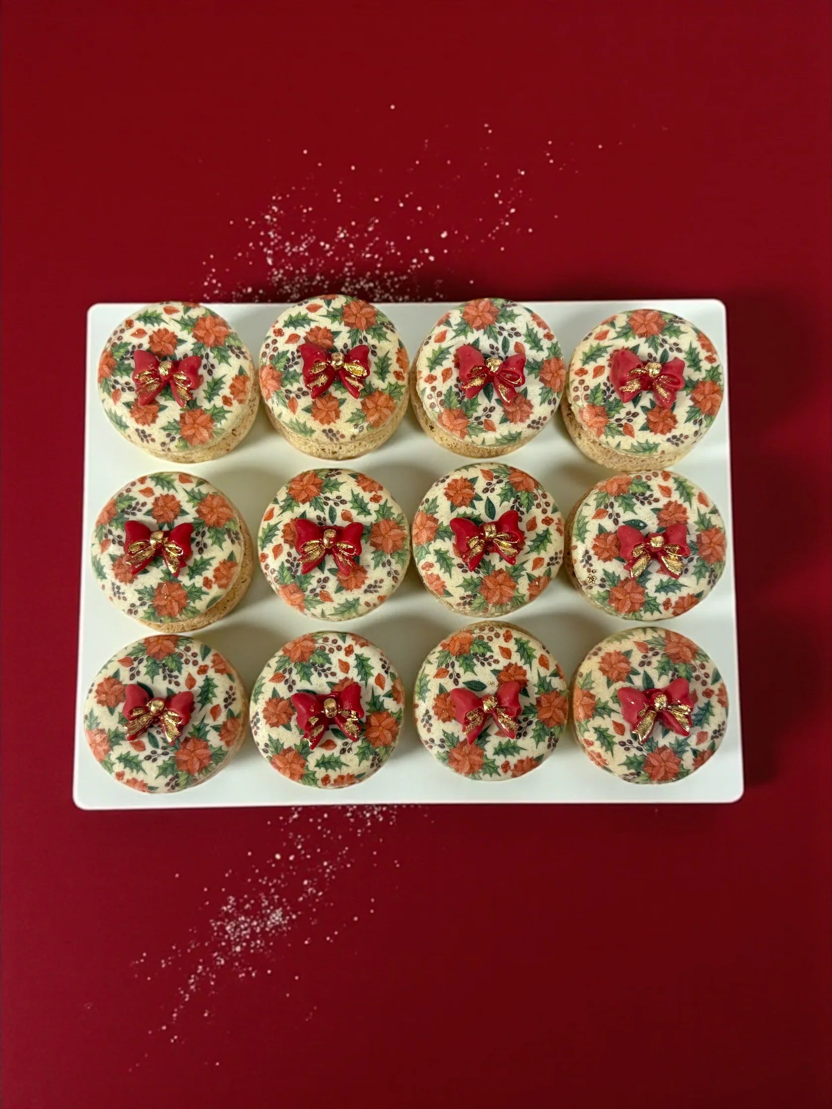 Celebrate the holidays with sophistication — these poinsettia-patterned macarons feature delicate red bows and festive flair, the perfect centerpiece for any holiday table. Buy Online