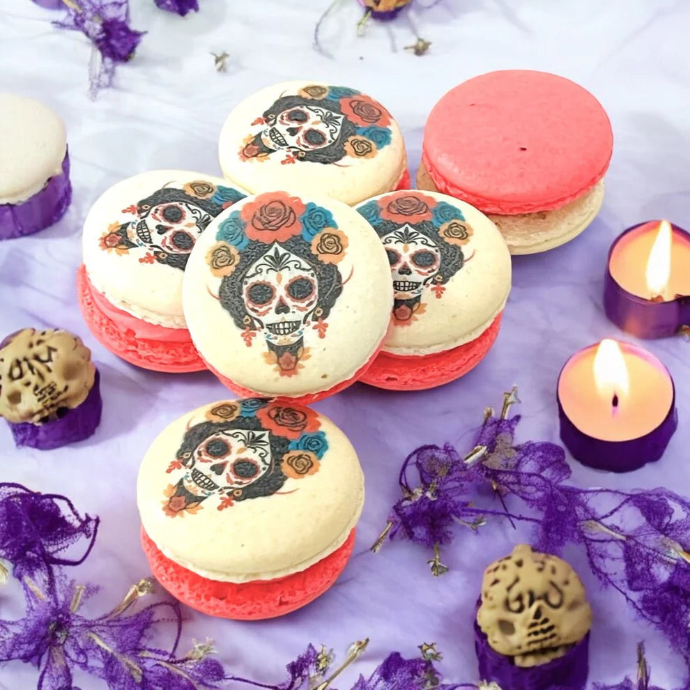 A festive fusion of flavor and artistry—each macaron inspired by the colors of Día de los Muertos.