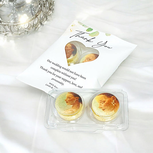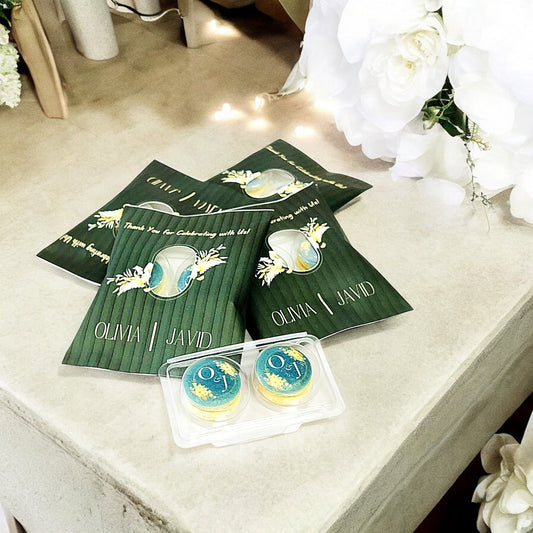 Fully Customizable Green Floral Oval-Window Wedding Macaron Favor Set – Design Pouch, Flavor & Print