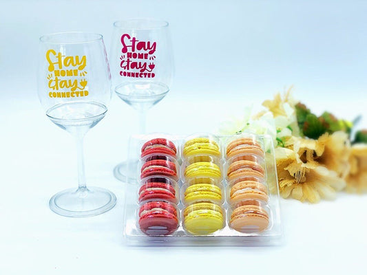 Macarons gift set for 2 with customizable stem wine glass | perfect for your next virtual party | stay home and connect