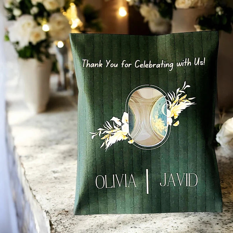 For couples who want a sleek and refined presentation, the Elegant Pouch is a perfect choice. Made from smooth paper, this pouch features a clear window that gives guests a sneak peek at the delightful treats inside. Its minimalist yet sophisticated design makes it an ideal favor for modern or contemporary weddings. You can further personalize the pouch with custom designs, monograms to align with your wedding theme.