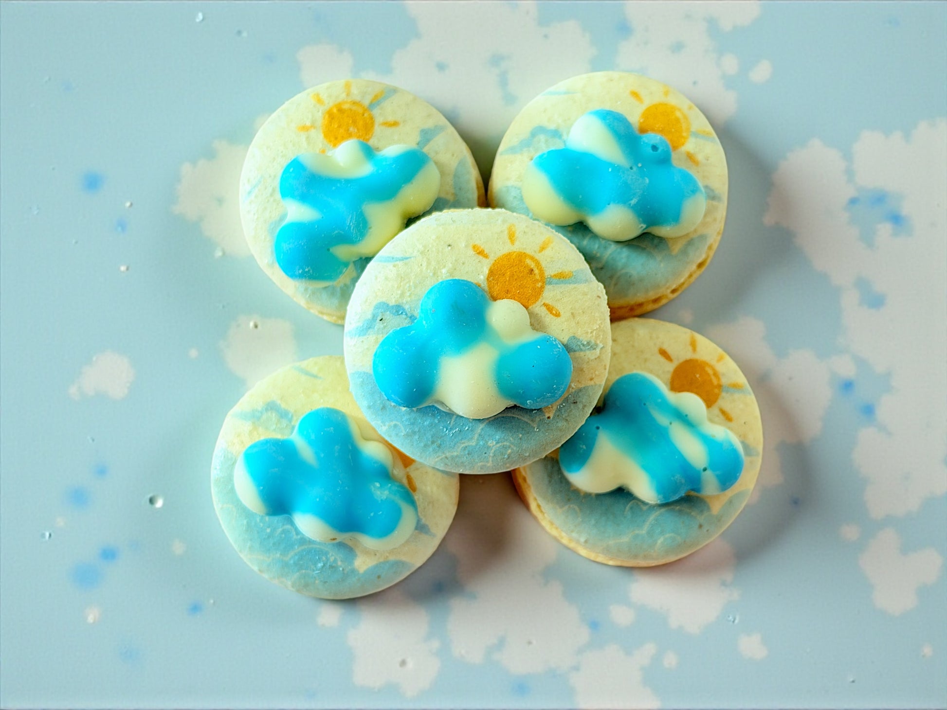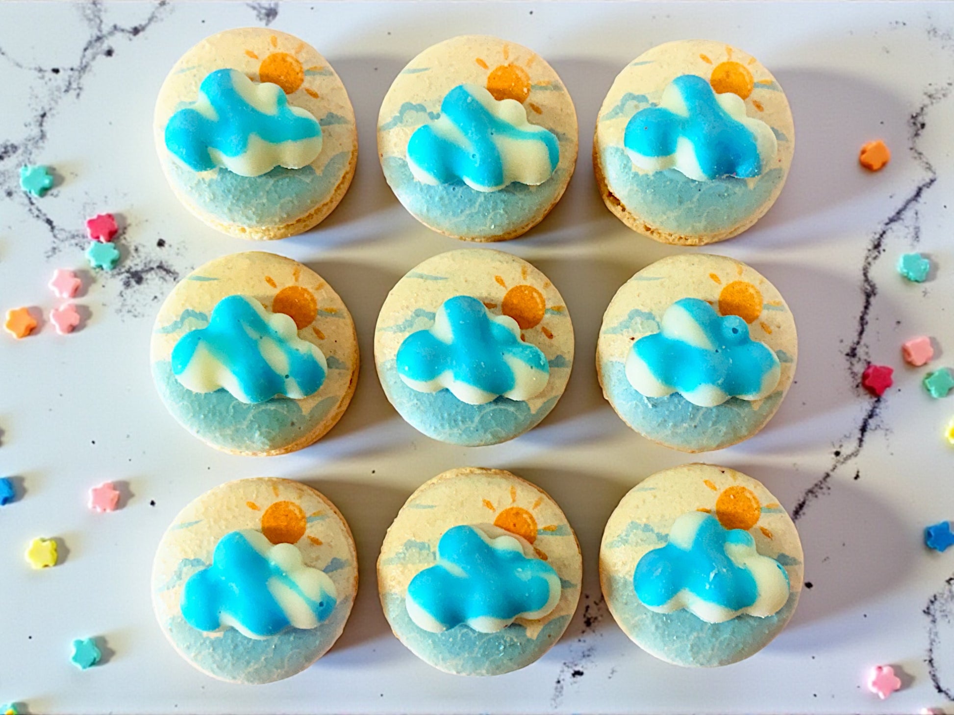 Brighten any day with our Little Clouds & Sunshine Macarons, a playful and cheerful collection inspired by blue skies, fluffy clouds, and golden sunshine. Each macaron features a charming cloud design in soft pastel tones, making this set a visual delight and a joy to share.