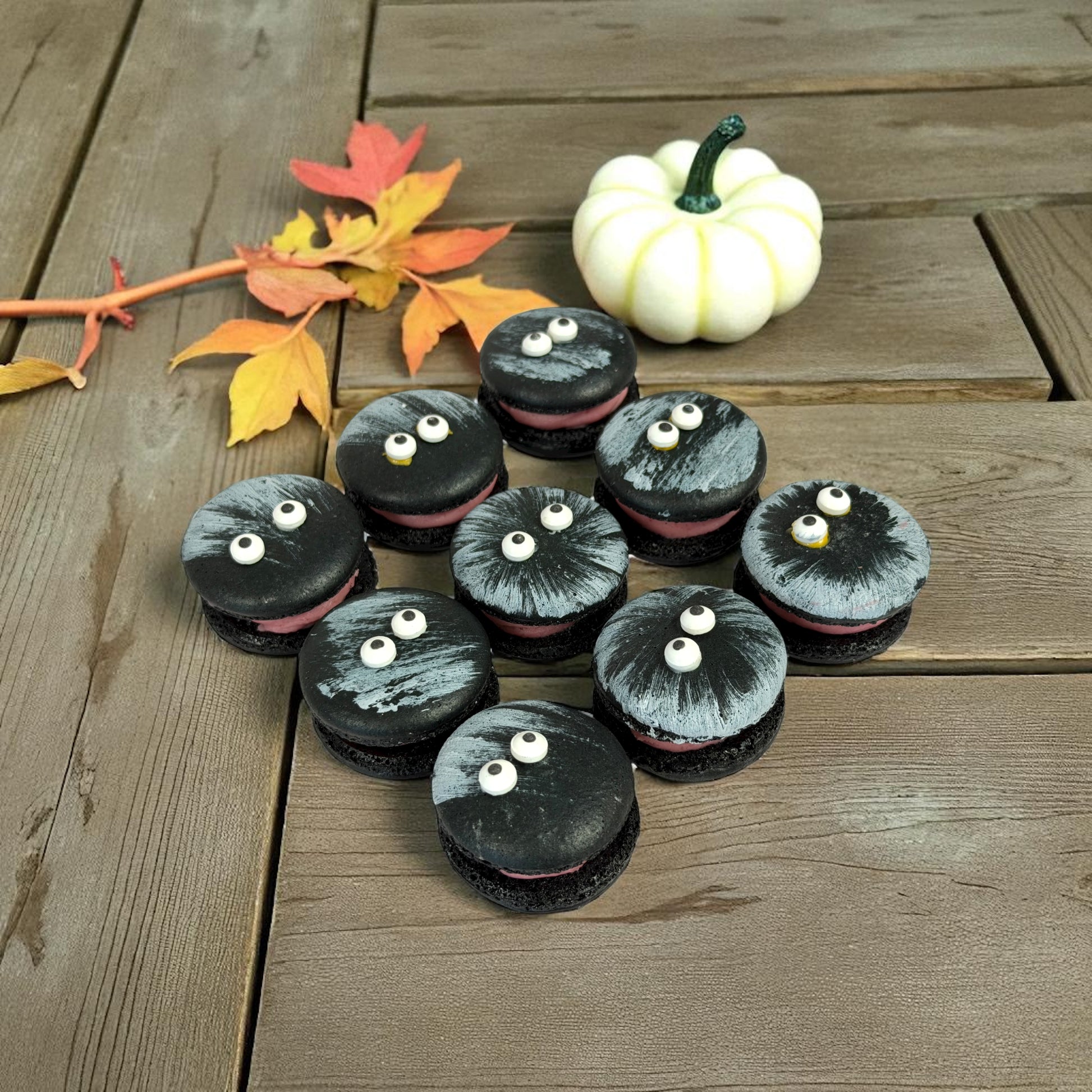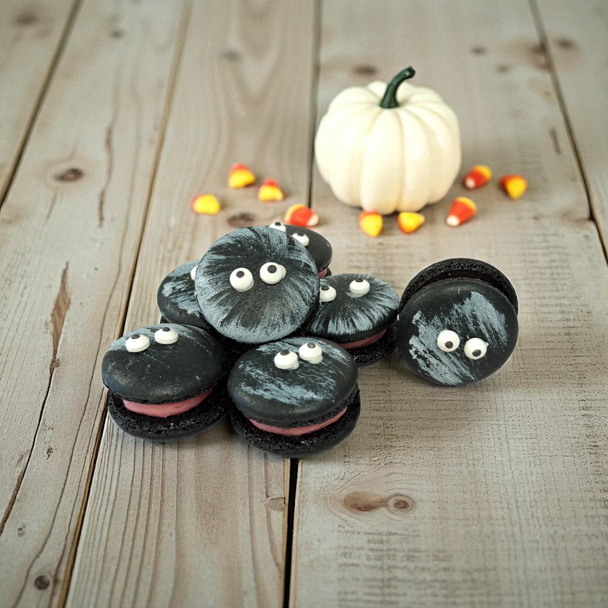 Make your celebrations playful and delicious with our Pee-Ka-Boo French Macarons. These festive black macarons are decorated with candy eyes that seem to be peeking right at you — spooky, silly, and perfect for Halloween or any themed party.