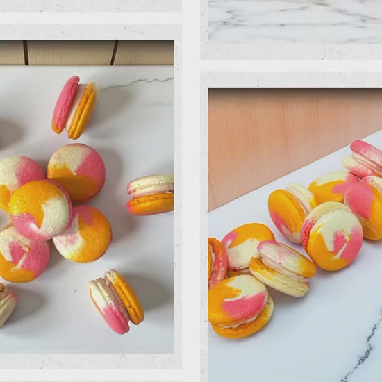 Bright, bold, and bursting with flavor — our 6-Pack Berry Mango Wave French Macarons bring tropical sunshine to every bite. Each colorful shell swirls together raspberry pink, mango orange, and creamy white, filled with a luscious pairing of sweet mango and tangy raspberry. Perfect for gifting, small celebrations, or simply treating yourself, these macarons deliver vibrant flavor and elegant presentation in a perfectly portioned box.