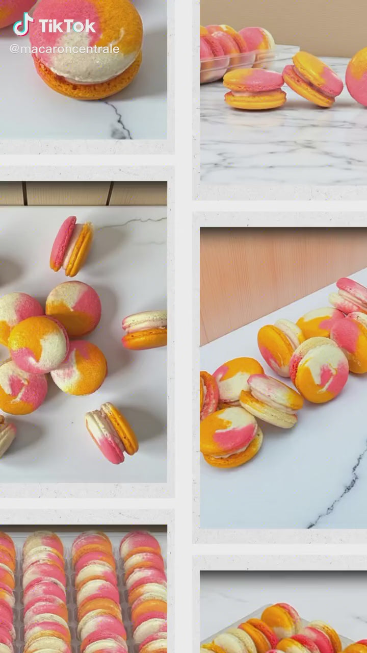 Ingredients: almond flour, sugar, egg white, cream of tartar, vegetable oil, chocolate ganache, raspberry puree, mango puree, edible color.