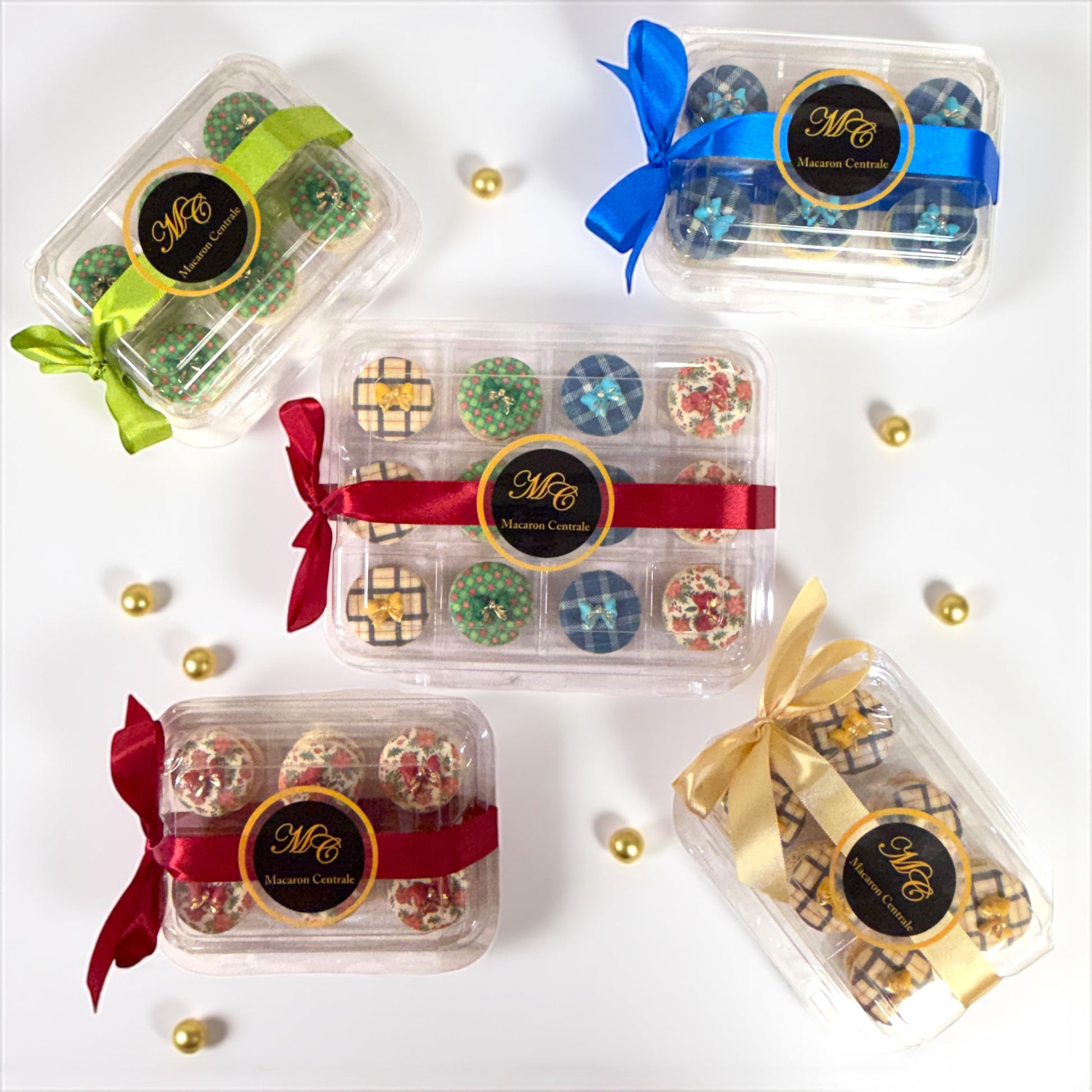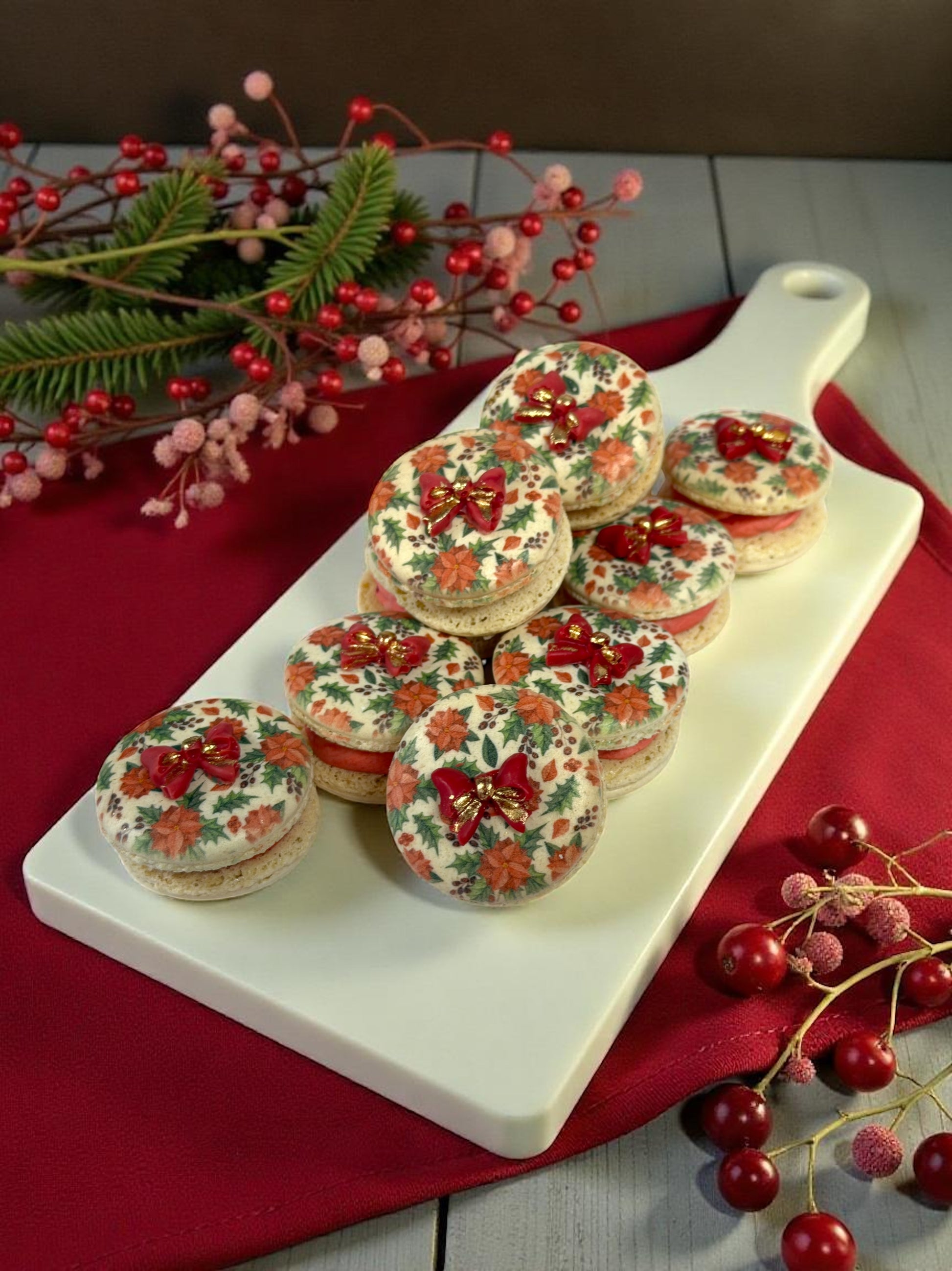 Bring the spirit of the holidays to your table with our Crimson Bow Holiday Macarons, a featured set in the Season of Joy Collection. Each macaron shell is adorned with festive poinsettia patterns and topped with a striking crimson bow, creating a dessert that looks as beautiful as it tastes.