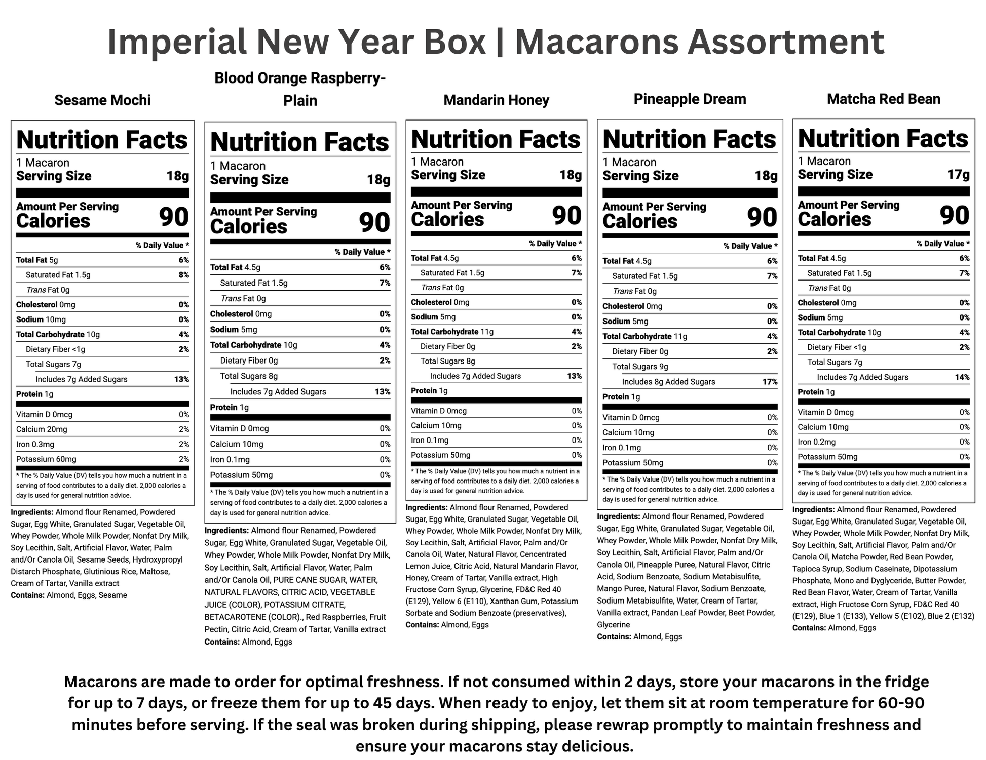 Celebrate sweetness, prosperity, and new beginnings with our Imperial New Year Assortment, a luxurious 50-pack featuring five festive flavors, ten macarons each. Every macaron is handcrafted fresh to order in our Northern California kitchen, using our signature almond meringue shells and creamy, deeply flavored fillings.