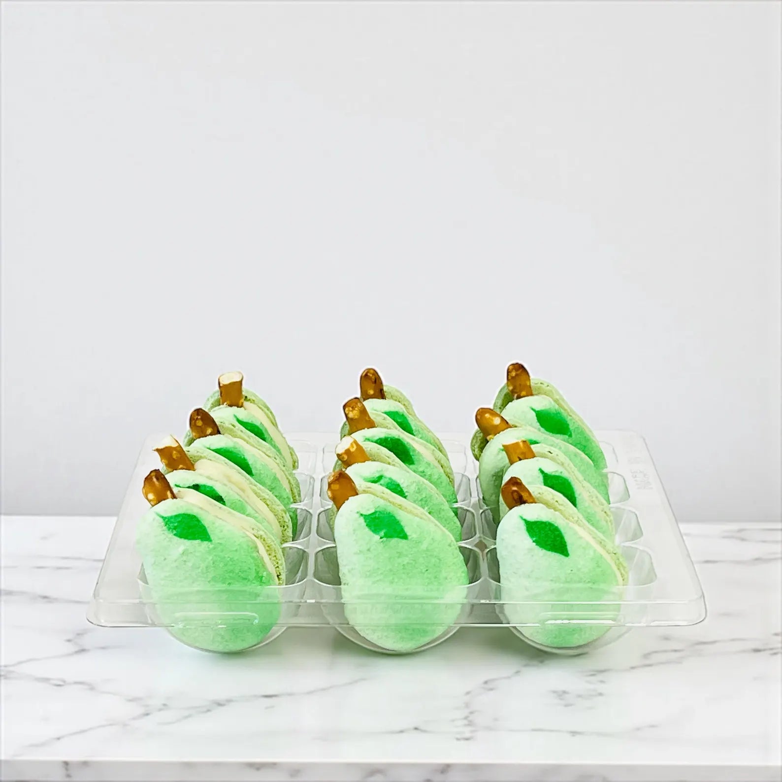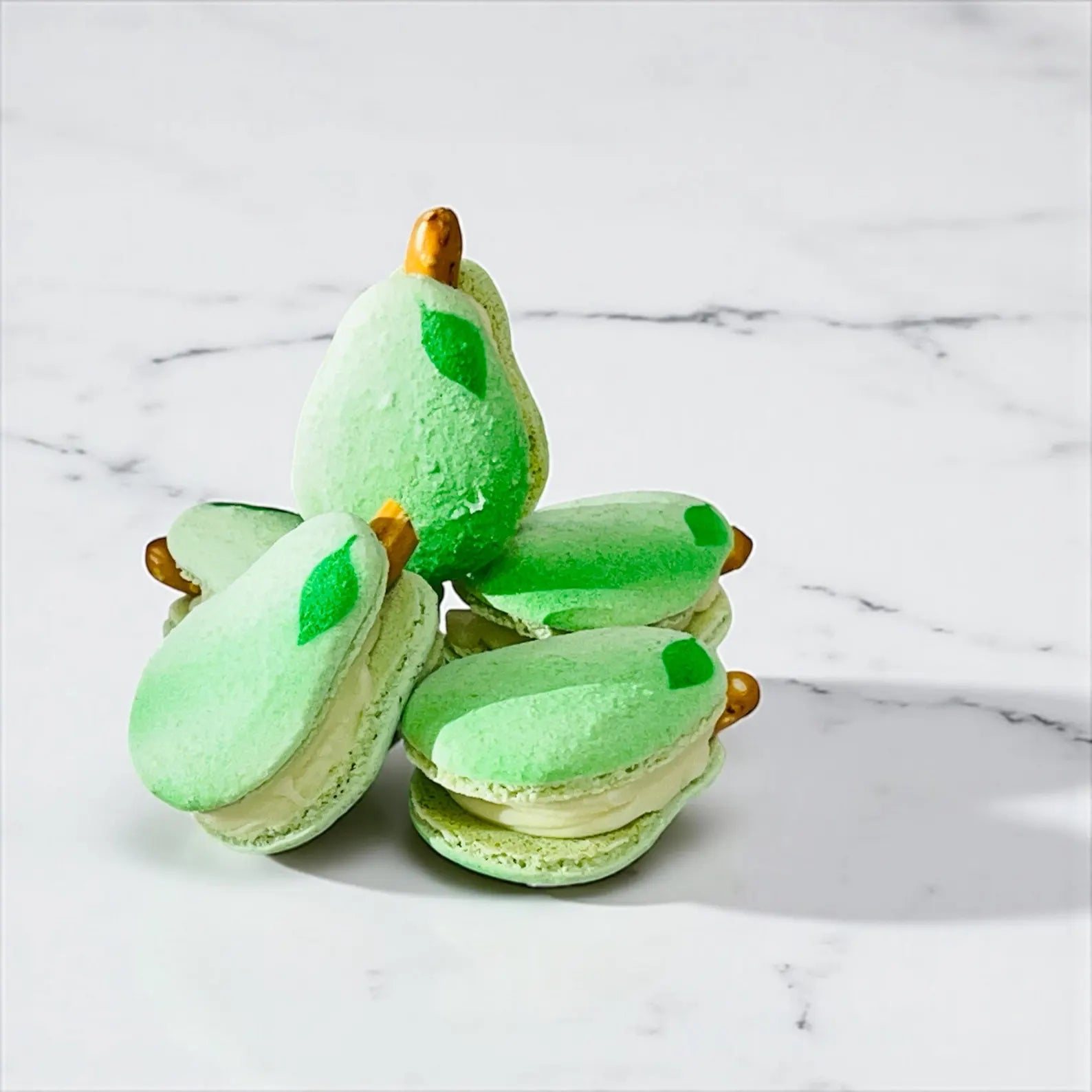 Delight in the elegance of our Pear-Shaped French Macaron, a charming confection that blends artistry and flavor in every bite. Each macaron is handcrafted into a pear shape, complete with a tiny gluten-free pretzel stem and hand-painted green leaf for a realistic finish.