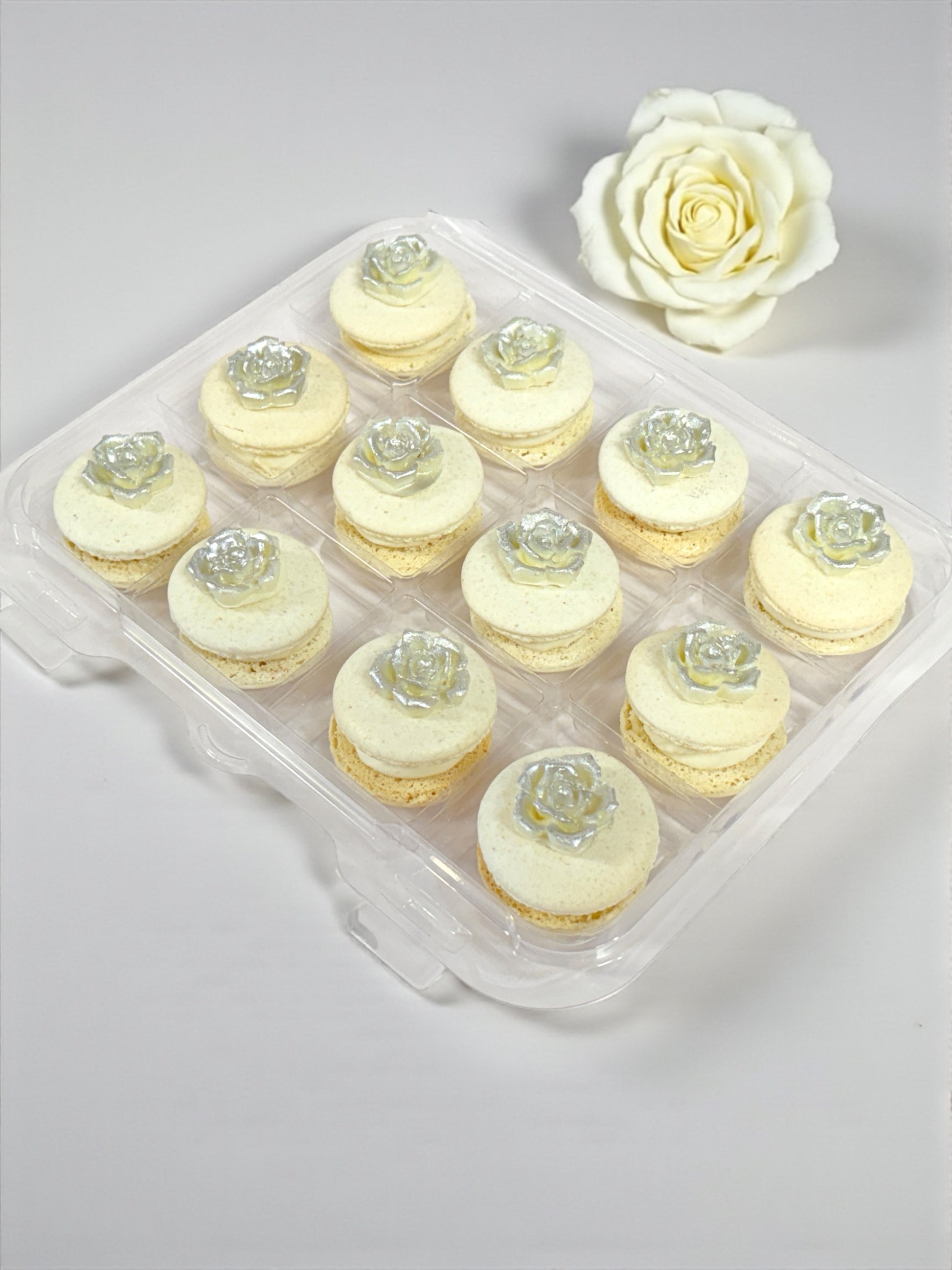 Every piece is finished with a detailed silver rose charm, creating a stunning floral look ideal for weddings, bridal showers, anniversaries, corporate gifting, and elegant dessert tables. Your macarons arrive securely packaged in a clear macaron tray—sealed for freshness, protected during transit, and ready for effortless display.