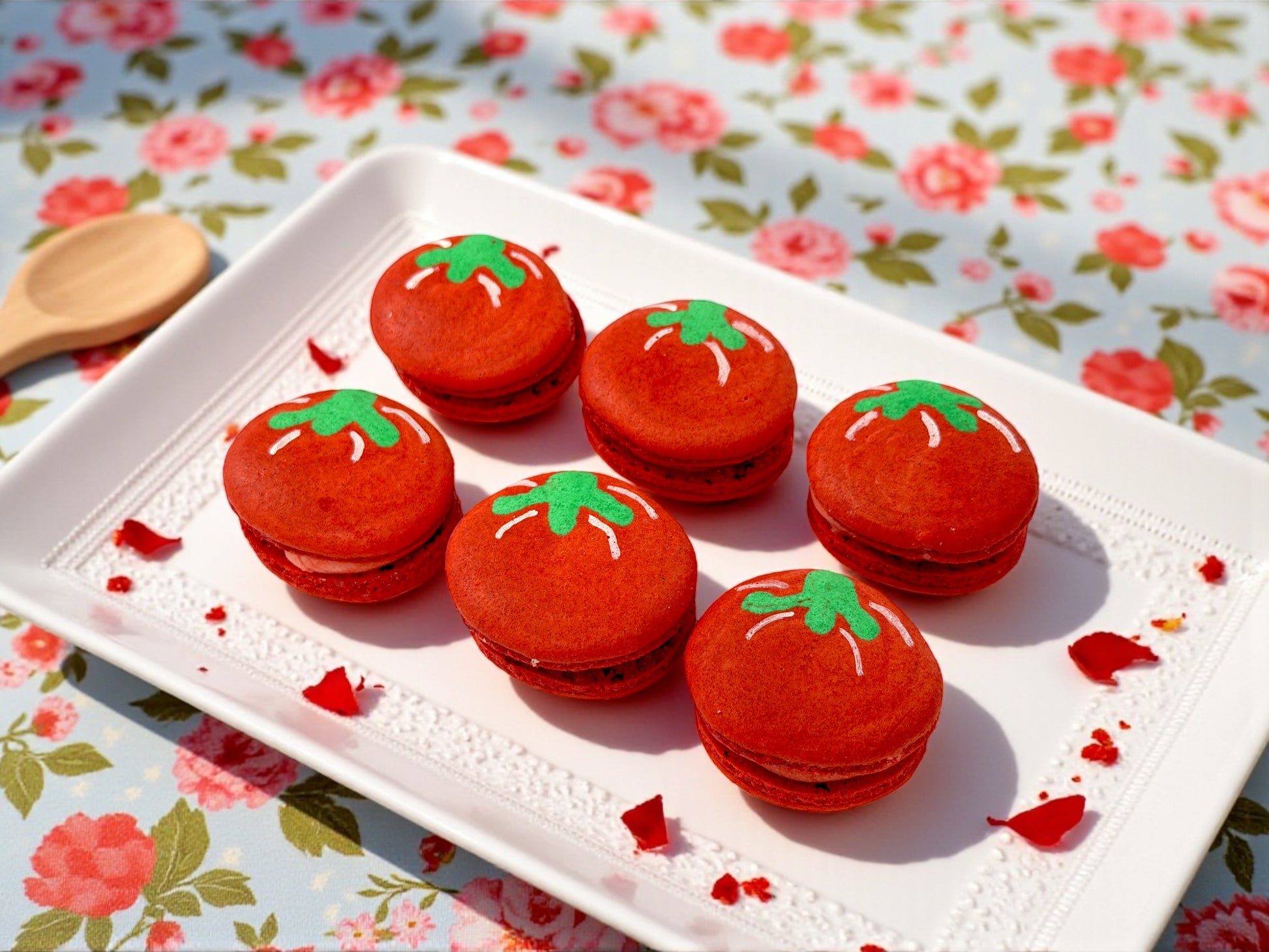 Bring a playful twist to your dessert collection with our Tomato French Macarons — a delightful blend of artistry and flavor. Each piece is hand-piped, baked to perfection, and decorated to look like a ripe tomato with hand-drawn green leaves and white details.