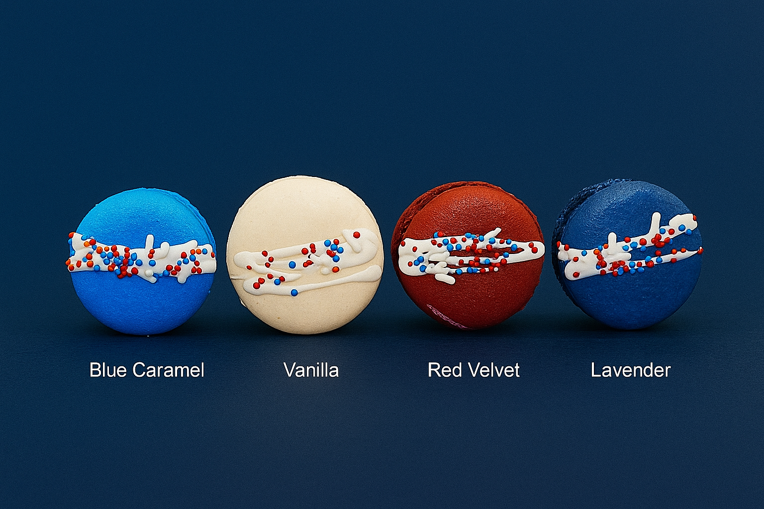 Ingredients: almond flour, sugar, egg whites, raspberry flavor, unsalted butter, vanilla extract, blue, red, white and blue nonpareils, cocoa powder, lavender extract, salted caramel ganache.