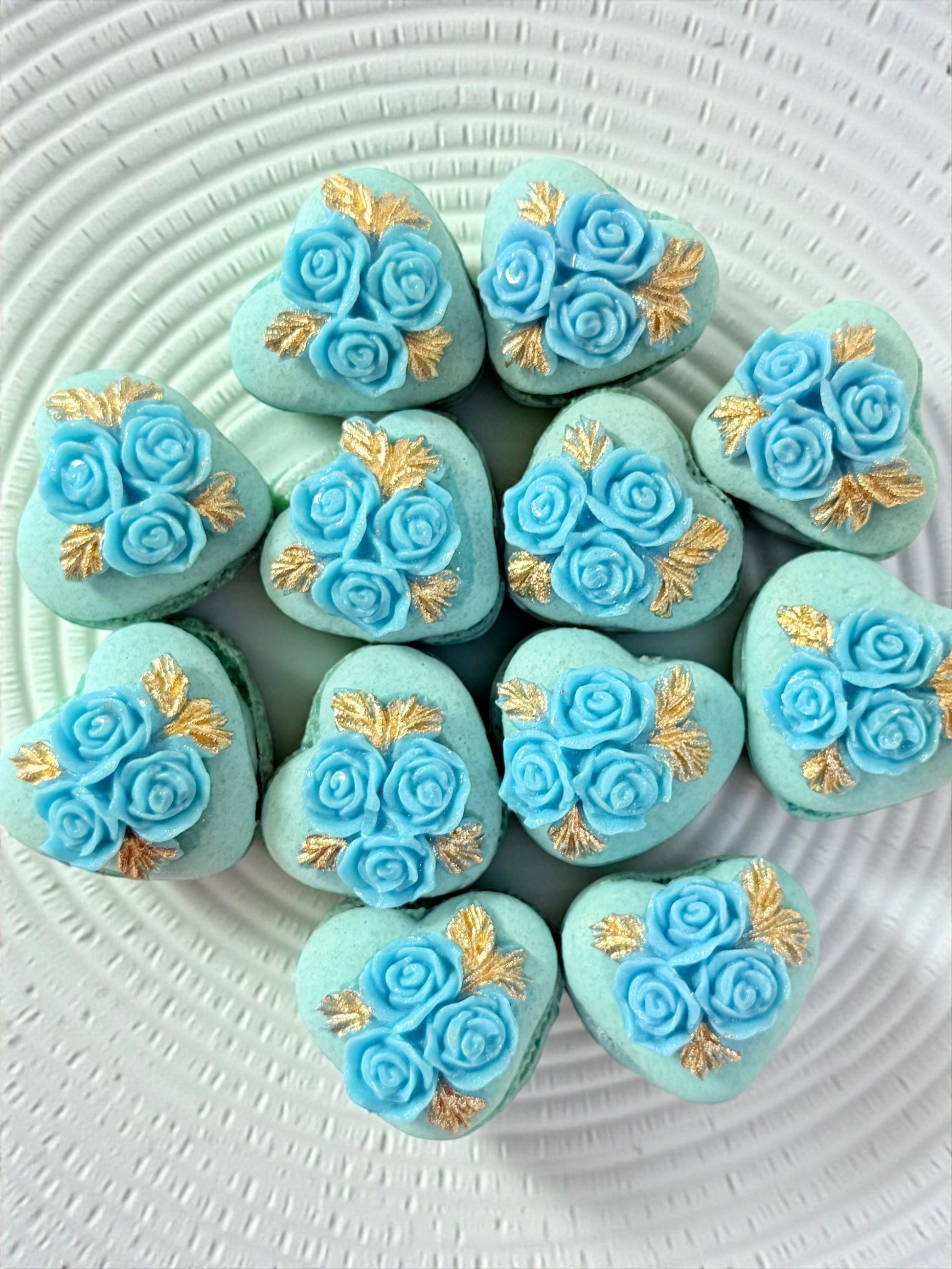 Celebrate any occasion with our Vegan Blue Rosette Heart French Macarons — a beautifully crafted, fully vegan treat designed to impress. These heart-shaped macarons feature soft blue shells decorated with vegan rosettes cocoa butter gem and elegant gold accents, creating a refined and memorable presentation.