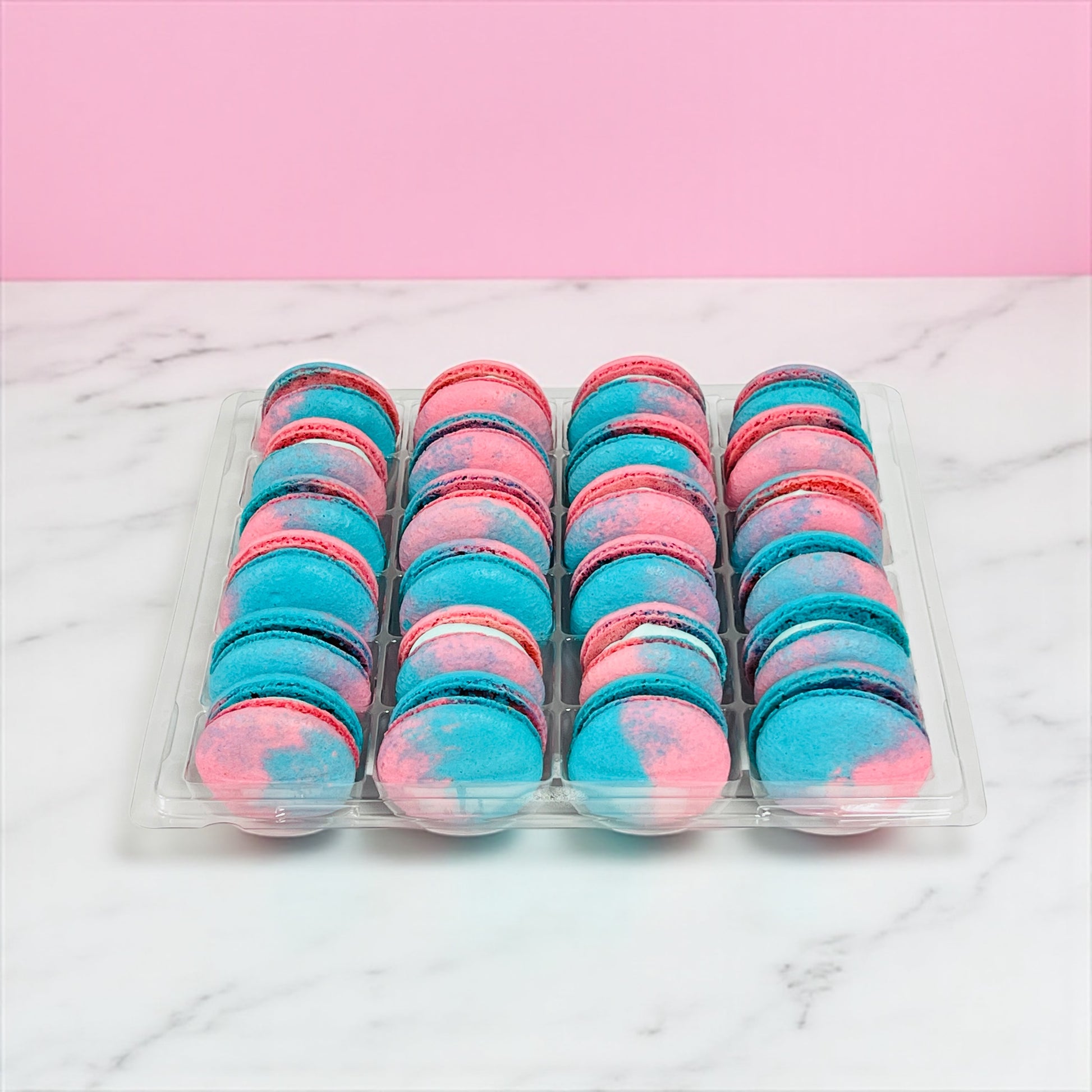 Delight your customers or impress your large guest groups with our Blue Raspberry Vegan Macarons, available in 24 or 48 pack sizes. Each macaron features a beautiful swirl of pink and blue shells with a smooth, tangy-sweet blue raspberry cream inside.