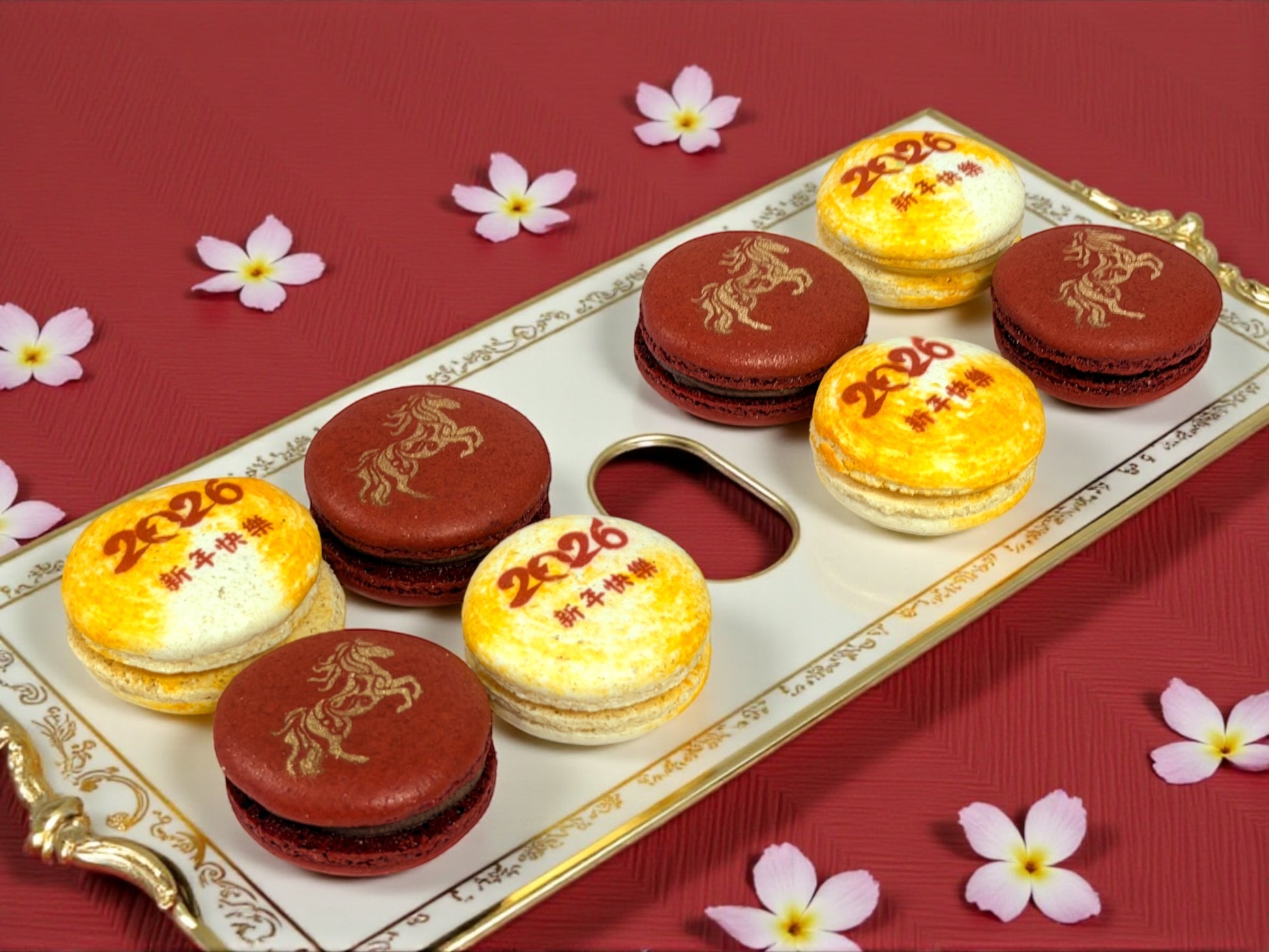 Celebrate the Year of the Horse 2026 with this elegant vegan macaron set, thoughtfully designed to bring good fortune, strength, and fresh beginnings into the New Year.